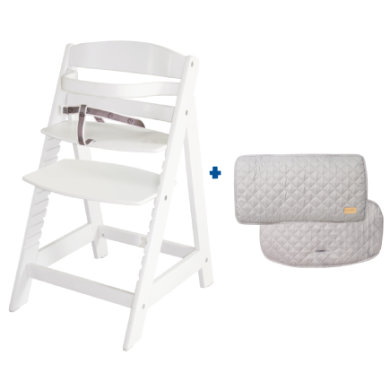 Der roba Treppenhochstuhl ‘Sit Up III’ ist ein sicherer und mitwachsender Hochstuhl mit abnehmbarem Schutzbügel und Gurtsystem. Die Sitz- und Fußplatte des Kinderstuhles lassen sich für eine ergonomisch richtige Sitzeinstellung in Höhe und Tiefe verstellen und an die jeweilige Wachstumsphase deines Kindes anpassen. Der Kinderhochstuhl bietet eine optimale Unterstützung des Rückens und der richtigen Sitzhaltung unabhängig von der Größe des Kindes. Der stabile Hochstuhl aus Holz hat durch seine spezielle Konstruktion eine hohe Kippsicherheit. Der abnehmbare Sicherheitsbügel und das Gurtsystem bieten zusätzlichen Schutz im Kleinkindalter. Der Hochstuhl ist für verschiedene Tischhöhen geeignet und von Esstisch bis zum Kinderschreibtisch flexibel anpassbar. Als Babyhochstuhl für Kleinkinder, die ohne fremde Hilfe sitzen können (ab ca. 6 Monaten), geeignet und bis ca. 50 kg belastbar. Die Sitzhöhe des Hochstuhls liegt bei max. 55 Zentimetern, die unterste Einstellung liegt bei 42,5 cm. Sitz- und Fußbrett können nach Belieben in die jeweiligen Einschübe mit einem Handgriff geschoben werden. Der mitwachsende Hochstuhl “Sit Up” ist nach den aktuellsten Sicherheitsstandards nach Norm EN 14988-1+2:2006+A1:2012 entwickelt und produziert. Alle verwendeten Materialien sind zertifiziert und werden regelmäßig geprüft. Der verwendete Lack ist lebensmittelecht und hautverträglich. 2-teiliger Sitzverkleinerer “roba style” passend für Hochstuhl aus pflegeleichter, abwaschbarer, gesteppter Microfaser (100 % PES). Materialien sind schadstoffgeprüft, zertifiziert und werden regelmäßig geprüft. Produktdetails: Hochstuhl Farbe: weiß Material: Formholz / Schichtholz, lackiert Maße: Breite x Tiefe x Höhe 44,5 x 54 x 80 cm Sitzhöhe: Max./Min. 55/42,5 cm Sitz- und Fußbrett in der Höhe variabel verstellbar Mit Schutzbügel 3-Punkt-Gurt Gurtsystem Zweigeteilte Rückenlehne Belastbar bis 50 kg Sitzverkleinerer Farbe: grau Material : 100 % Polyester Material Füllung: Polyestervlies Maße: Breite x Tiefe x Höhe 40 x 2 x 25 cm Der Sitzverkleinerer ist aus gesteppter Microfaser Bei 30°C in der Maschine waschbar Abwischbar und pflegeleicht Trocknergeeignet Alle verwendeten Materialien sind schadstoffgeprüft und zertifiziert Passend zu allen roba Treppenhochstühlen 7562, 7563, 7566, 7570 und 275062 Lieferumfang: Treppenhochstuhl Sicherheitsbügel 3-Punkt Gurtsystem Sitzverkleinerer